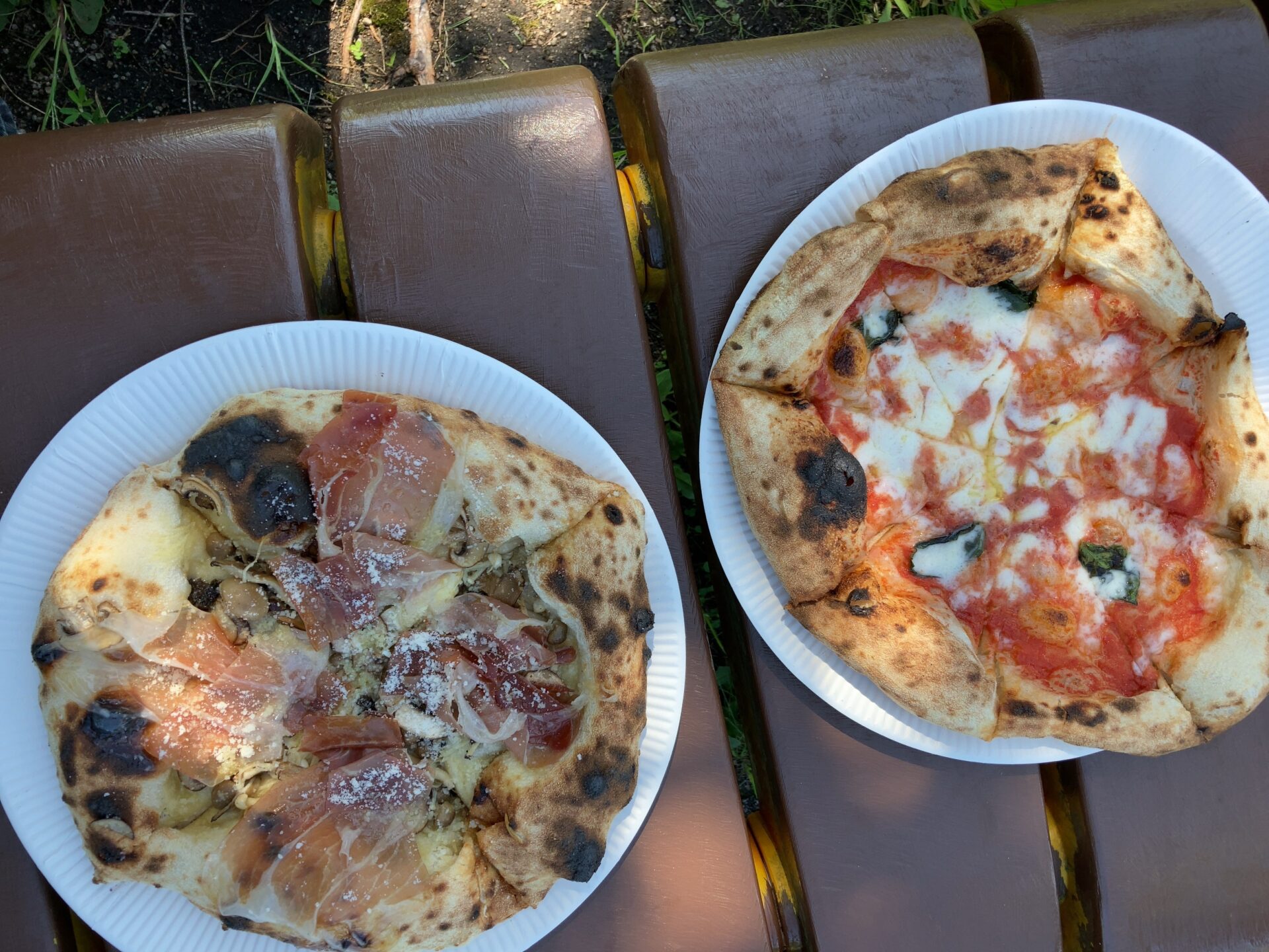 今回は生ハムとキノコたっぷりバージョンも♡家まで待てず、広場のベンチで頂きました♪
